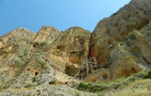 After a few minutes we reached a tall, shallow cave, occupied by cows seeking respite from the sun and heat. Without intruding to disturb them, we continued on the path, making our way across the rock- and vegetation-strewn mountainside. I looked up from time to time to see if I could make out any caves or other curiosities. At last we reached a small stone structure built up against the cliff wall. I crept my way inside, avoiding fresh cowpats, and found two guilty-looking cows huddled up against one of the walls within the house.