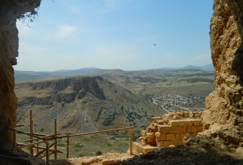 Access to the fortress, known as Qalat abu-Ma’an, is provided by wide, basalt steps, which I climbed enthusiastically. At the top, I entered the stone structure, partially under restoration with external and internal scaffolding. Wooden stairs inside to me from one part of the fortress to the other, and I gazed out towards Mount Nitai and the sprawling view below.